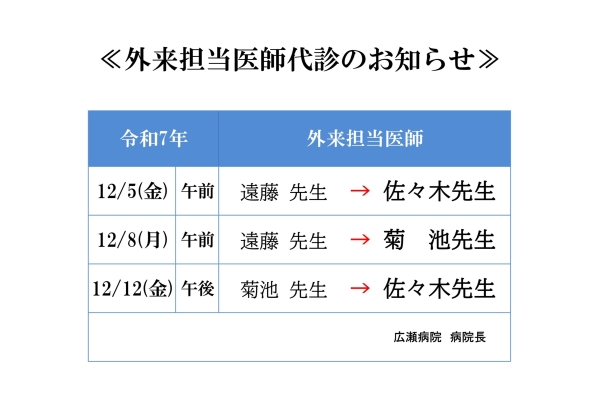 令和7年10月1日(水)より外来担当医師・診療時間が下記の通り変更となります。