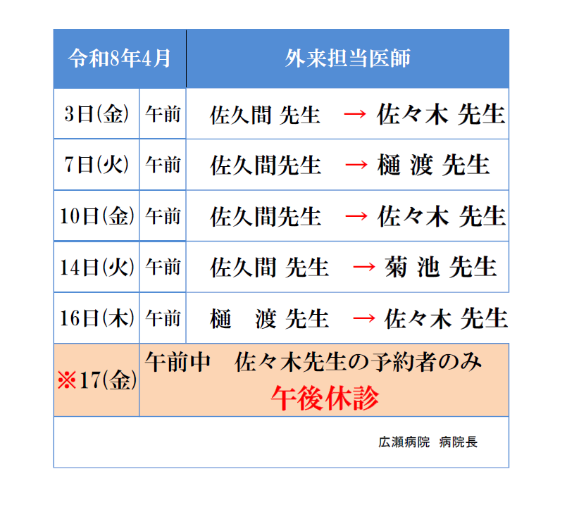 令和8年4月20日(月)より外来担当医師が下記の通り変更となります。